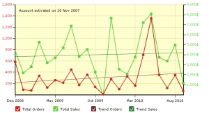 - Graphs of sales using AMCharts, which is an excellent Flash-based graph package. You can drive it from PHP by building XML on-the-fly. The variety, quality and cleverness of these graphs is truly remarkable.
