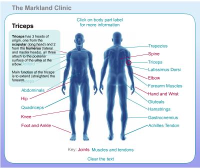 A second Flash presentation was slightly more unusual, a “Bodymap”. Map of human body, joints and muscles labelled A diagram of the human body was overlaid with labels for joints and muscles. As you click on a label, explanatory text is revealed. Again I used Xara and found it excellently suited to the task. I was also pleased to be a party to the sensible use of Flash. Normally it is just distracting bells-and-whistles.