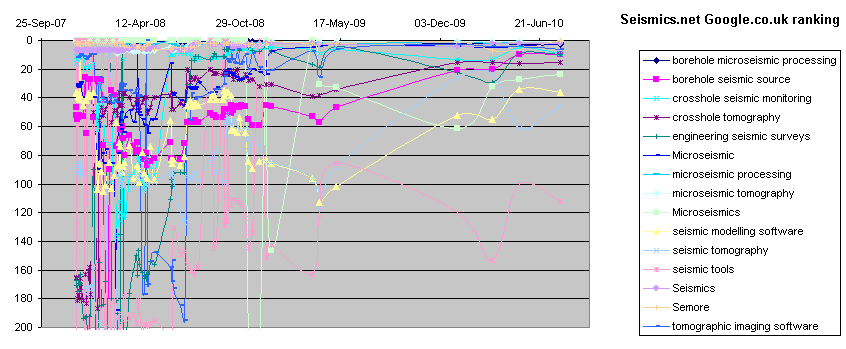 After a couple of week’s furtling amongst the fine-print, we got some “fantastic” (Ben’s words) improvement on Google.co.uk. We went from nothing to Number 2 for “microseismic software”, from 26 to 1 for “borehole microseismic processing”, number 1 for other phrases, along with big jumps into at least the middle rank for a big bunch of other phrases. This is all the more impressive when you realise that Ben is up against some very big corporate guns in the oil industry, global organisations with some big budgets.