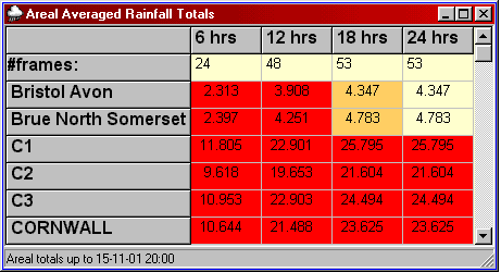 Alarms can be raised if rainfall in any location exceeds pre-set critical thresholds. The user configures a set of “sub-catchment areas”, such as heavily urbanised zones, or upstream of flood-prone areas. Storm then uses the rainfall amounts from every radar frame to calculate how much rainfall has fallen in these critical areas, over a range of times, and raises audio and visual alarms if necessary.