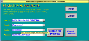 The software lets the user specify a combination of continental region, country, agency and sector, to identify projects. An example would be “all projects in Latin America and Caribbean, involving Education, and funded by the World Bank”.